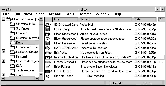 Groupwise, shown in Figure 13.11, is a popular LAN e-mail system that has a simple add-on for Internet mail. For offices currently using Groupwise mail, it's easy and relatively inexpensive to incorporate Internet mail into LAN mail. Groupwise isn't recommended for offices without established Internet e-mail because of its lack of features and its inability to conform to new standards as they evolve. Currently, it's available only for Windows 3.1 and Macintosh systems.
