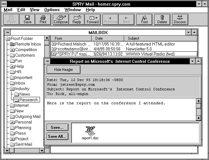 SPRY Mail, shown in Figure 13.12, is the mail client that comes with the popular Internet in a Box software. It is a fairly good mail client, boasting speed and ease of configuration. It has many of the same features as Eudora but works only with the Internet in a Box TCP/IP stack. One of its strongest features is its capability to view the inbox remotely, meaning that you can delete unwanted messages without downloading them. I recommend SPRY Mail for organizations that purchase a full suite of TCP/IP applications for users. SPRY Mail is available only for Windows 3.1 and Windows 95.