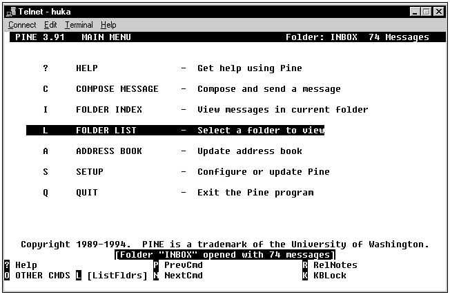 Pine, shown in Figure 13.13, isn't really a mail client. It's actually a program that resides on the server and is standard with many UNIX-based servers. It gives users the ability to read and send mail from almost any Internet connection. The mail remains on the server and can be saved in folders. Pine has many of the same features as the popular client-side mail tools, such as address books, search tools, and the ability to attach documents, and it has the added bonuses of being free and allowing users access to their mail from almost anywhere.