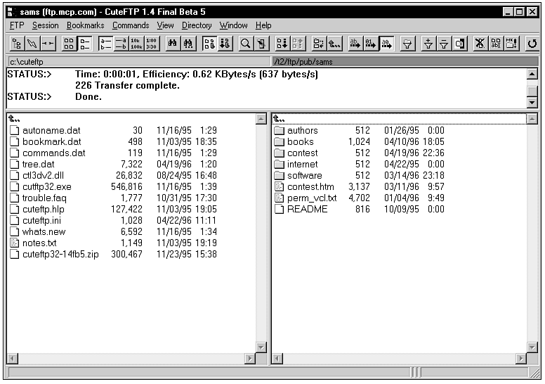 CuteFTP, shown in Figure 13.14, is a shareware/freeware program available on the Internet. It has many features and is used widely. CuteFTP provides an interface that looks much like a standard file manager, with the remote file system on one side of the window and the local file system on the other. Users can simply drag and drop files from the server to their machine or from their machine to the server. CuteFTP is available for Windows 3.1 and Windows 95 systems, but it isn't yet available for the Macintosh.