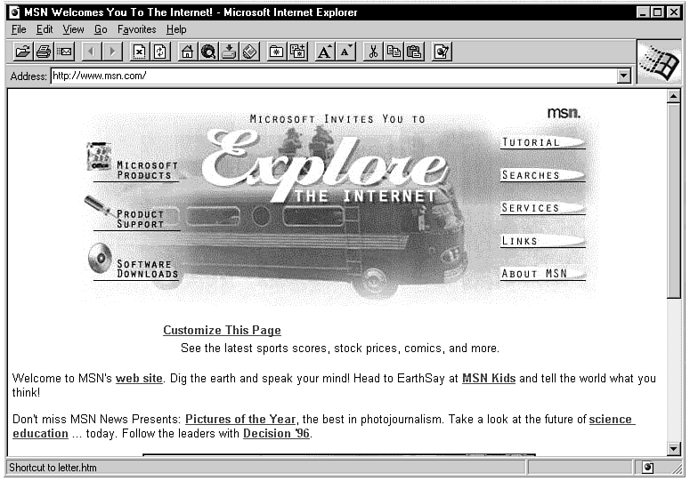 Explorer, shown in Figure 13.6, is Microsoft's answer to Netscape. It has many of Netscape's features (see Chapter 19, "Browsers: Viewing Corporate Information with HTML"). It is free with Windows 95, and it runs efficiently on 12 MB of RAM. There is little argument that Netscape is the better browser by almost any standard. It's fast, it has many features, and it offers more flexibility to Web content providers. However, Explorer is catching up. The Web world is still watching to see which application will dominate the market. Although Explorer has all the power of Microsoft behind it, some users think it will go the way of eight-track tapes.