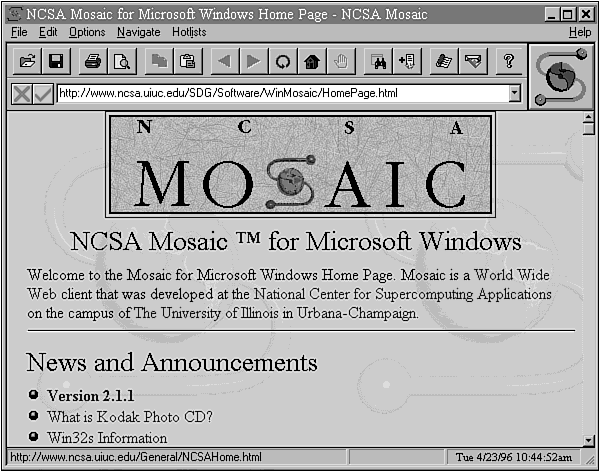 The National Center for Supercomputing Applications' (NCSA) Mosaic is a relatively full-featured low-end browser (see Figure 13.8). It's rich enough to cover all the basics, and it runs well on 4 MB of RAM. Mosaic is the basis for many browsers that come with commercial TCP/IP stacks. It's available on the Internet and costs about half as much as Netscape. Comparing Netscape to Mosaic is like comparing Microsoft Word to Microsoft Works: Although Netscape offers more features and extras, some users just don't need them, and therefore will find Mosaic suitable.