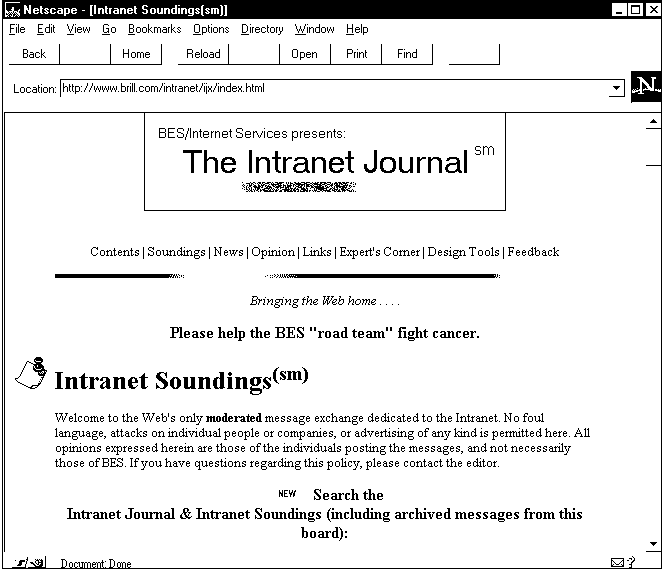 How the board's conversation threads look depends on the software application being used and on the capabilities of your browser. Until Web conferencing becomes more developed (with sound and graphics), you would be wise to keep things simple. Most successful Web conferences are conducted in an easy-to-use and easy-to-read environment. For example, look at the Web group conference administered by The Intranet Journal, shown in Figure 37.1.