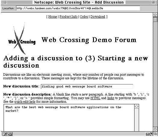 Figure 37.11: Web Crossing offers visitors to their hom site (http://lundeen.com) the opportunity to participate in a demo discussion.