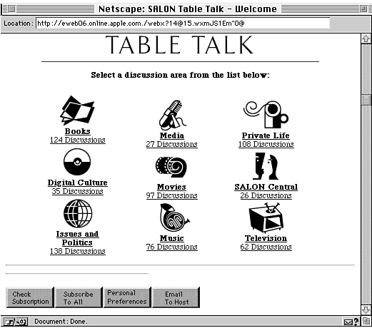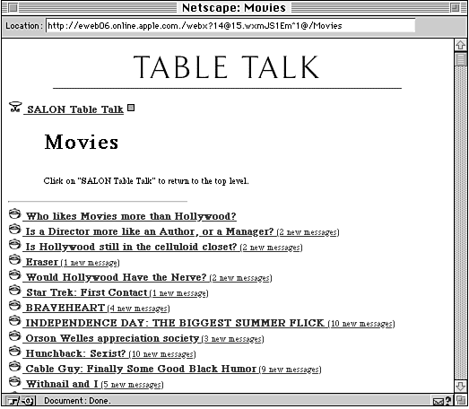 Table Talk is similar to The Well in that the group discussions revolve around popular topics like movies and sports, as shown in Figures 37.3 and 37.4. Apple uses Web Crossing, a Web message board software application, to run Table Talk. Web Crossing is reviewed later in this chapter.
