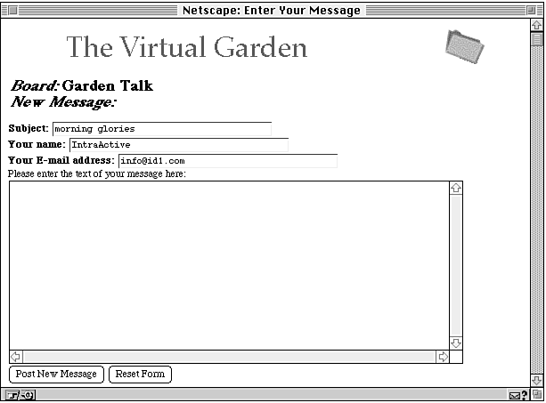 For an example of CGI-based message boards, visit Time-Warner's Pathfinder site at http://www.pathfinder.com. The Pathfinder message boards are oriented toward providing users with information about the Time-Warner companies, such as Geffen Records. Also on the site are a few topic-oriented boards such as the Virtual Garden, shown in Figure 37.6.