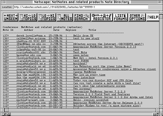 Figure 37.9: The NetNotes topic list is presented below a browser style menu bar.