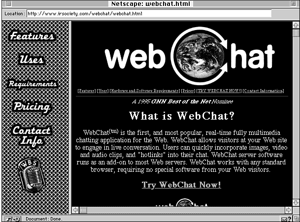 Figure 39.2: WebChat, at http://wbs.net is one of the first browser-based chat forums. It operates as a plug-in that you can download from the Web.