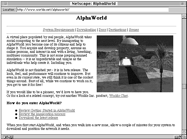 Figure 39.5: Worlds Inc.'s AlphaWorld is a graphic environment for real-time interaction.