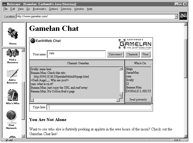 The look of your chat forums will depend on the software you choose. At this point, there aren't any real-time chat applications especially for intranets; but that doesn't mean that they aren't on their way. For an example of how an intranet chat might work, go to the EarthWeb Gamelan Page at http://www.ew.com, shown in Figure 39.6.