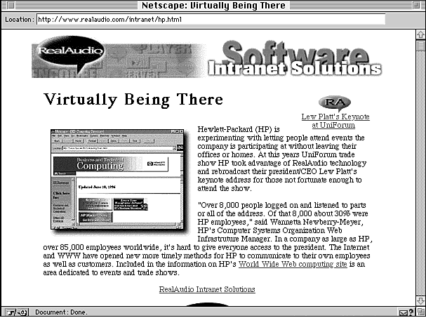 Streaming audio is another tool for Web chat. RealAudio, shown in Figure 39.7, already offers the means to hold live broadcasts on the Web.