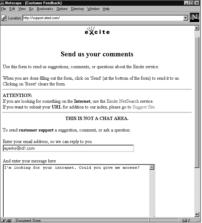 Figure 45.8: The Excite search engine uses this form to solicit questions and comments.