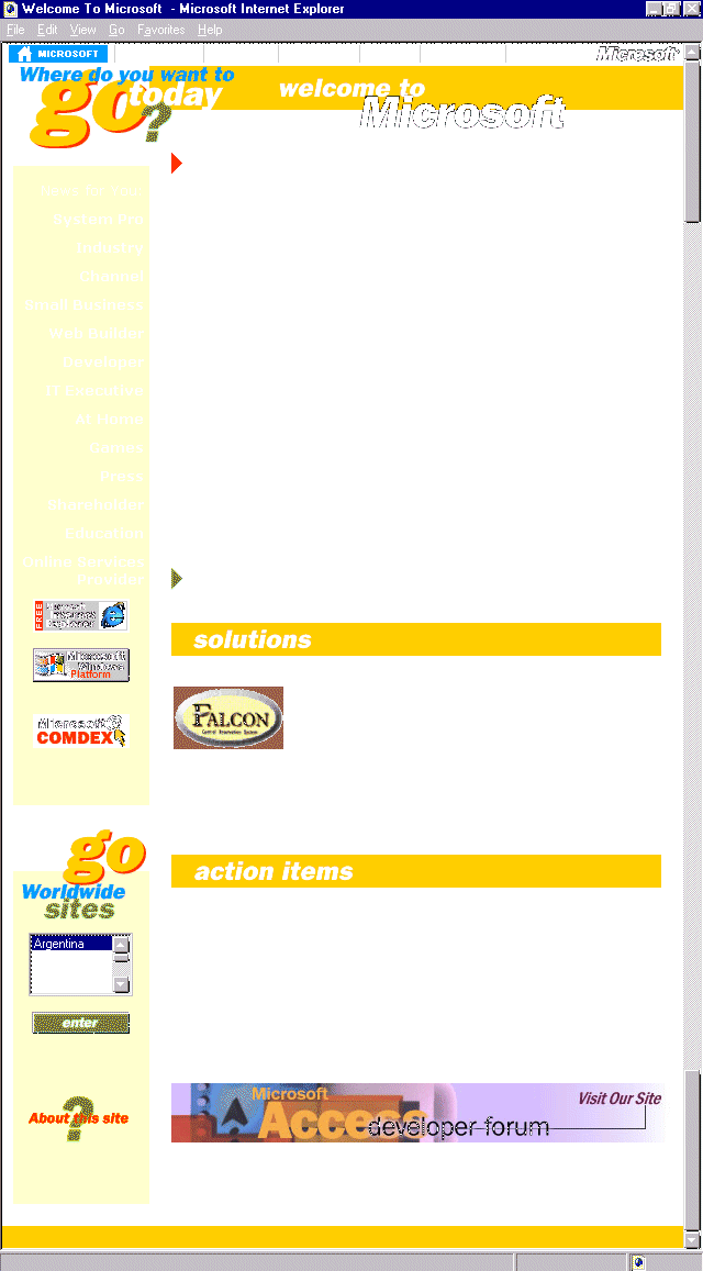msn. is followed by a discussion of its more conservative yet very extensive parent, Microsoft. The Microsoft site has gone through several incarnations of look and feel, currently settling on an effective top bar navigation, a technique that designers