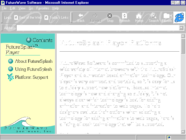 FutureSplash technology is delivered automatically to the Internet Explorer 3.0 browser. Netscape 3.0 handles it well, too, with a quick download of a plug-in.