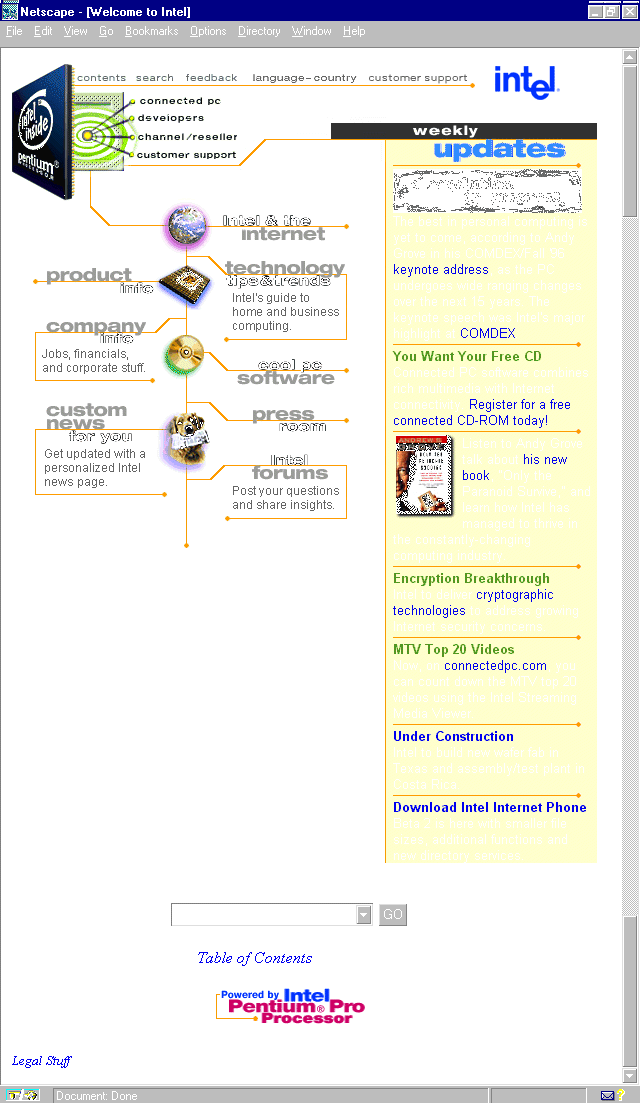 Intel has a nice site, although looking under its virtual skirt I found a way to save a few kilobytes by trimming the fat off of the HTML code. If you're looking for something on the Web, there are a wide range of search engines. Lycos will demonstrate