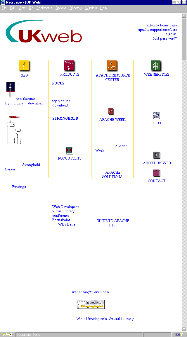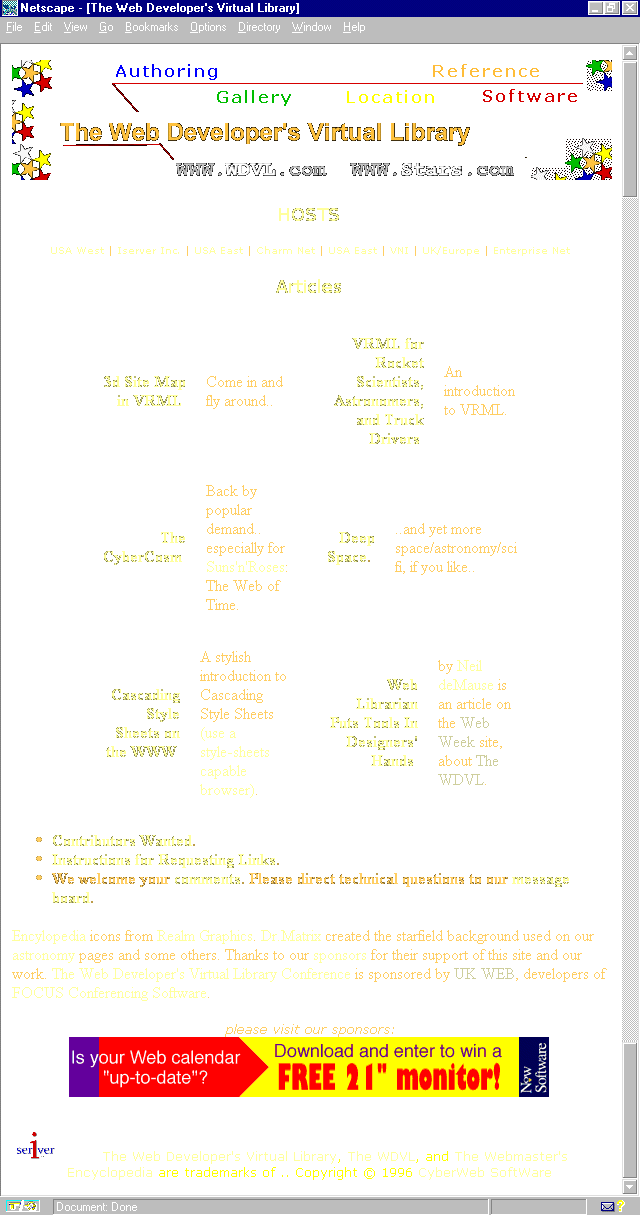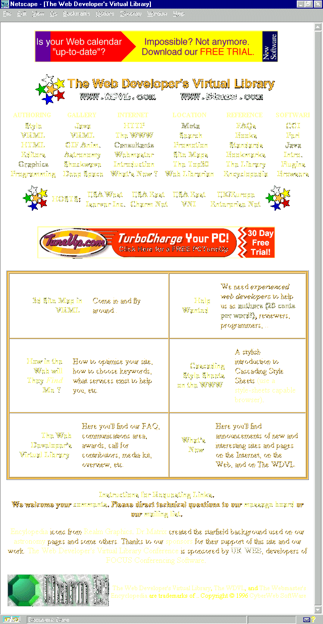 Traveling the big pipe, the next relay is UKweb, where customer service is a primary goal and mailto: links are never overlooked. Next up is the Web Developer's Virtual Library, an extremely useful site for Web designers that needs a facelift. Using