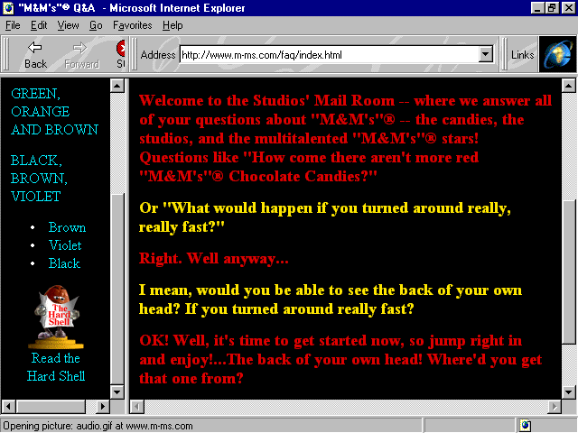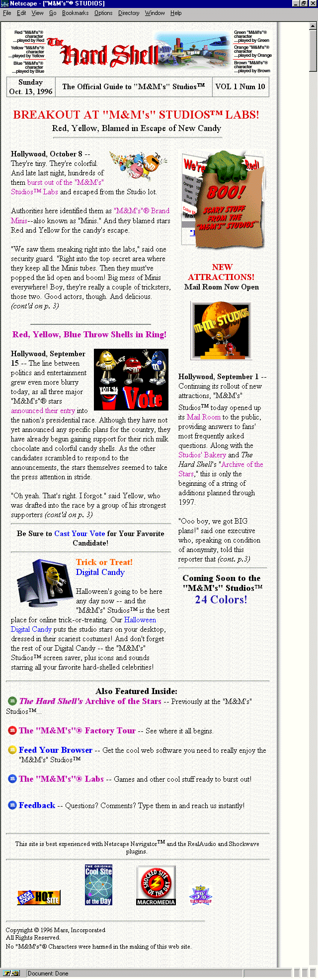 opening with an animated M&M character criticizing my screen, telling me it's filthy and dusty! Move to the "official" site guide for more fun and Web site details. Done in a newspaper style, this area is aptly named "The Hard