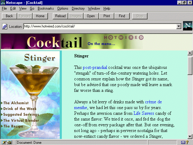 Hotwired, the online extension of the popular Wired magazine, has long been known for its high-style and uniquely expressive Web site. Enjoy a highball in the Hotwired cocktail lounge, where the recipe calls for history, cocktail protocol, links