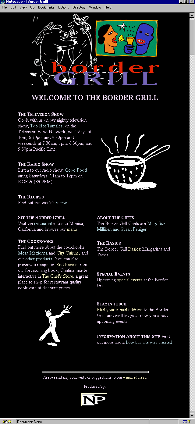 I absolutely adore the design of the Border Grill's main page. It's classy, the graphics are fun and witty, the layout intelligent, the content choices interestingthe entire look and feel suggests that I'm going to be treated to this style