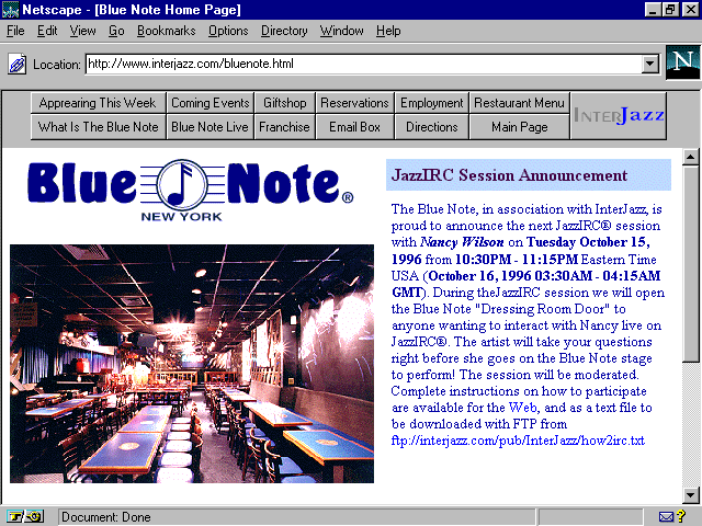 If you like music while you work or eat, the Blue Note Restaurant has just the ticket. Marvelous jazz from some of the world's best players can be enjoyed as I show you how to add color and pizzazz to Web sites by using the bgcolor argument within