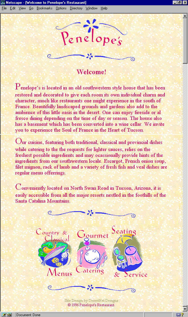 This oh-so-very French restaurant pleases the eye with yellow floral wallpaper and Matisse-like navigation. It's an unusual Web site, very feminine, and a fine example of the continuity I discussed earlier. Designer Laura Valentino created the look that