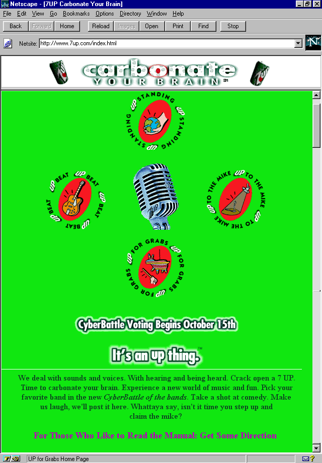 7 UP has dedicated each area to some special interest, including the support of alternative music, with a "cyberbattle of the bands" event; an opportunity for visitors to the site to speak their mind about any and every little thing; a