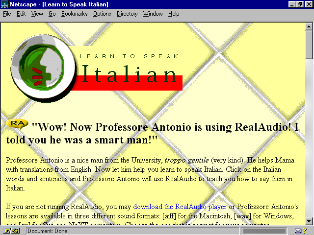 Mama Mia, this site is delizioso, meraviglioso, and fantastico! Mama offers up recipes, goodies, glossaries, and plenty of pasta. There's even a section where you can learn special Italian phrases from Professore Antonio, such as what to say to your