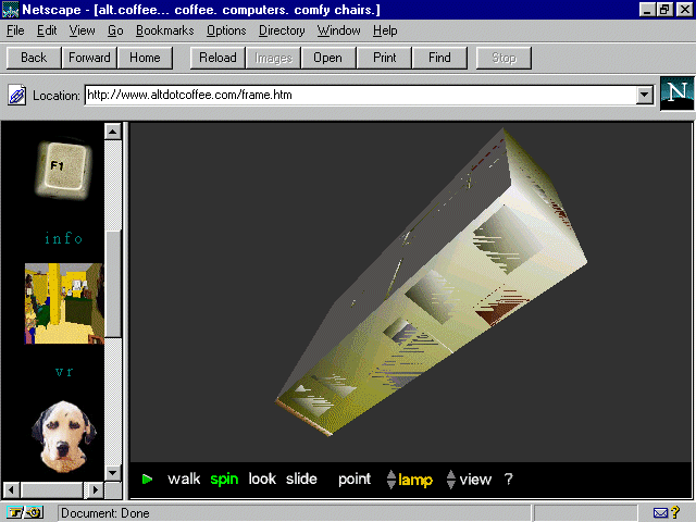 For those who want the joy without the calories, Virtual Reality is the perfect solution. Enjoy a tour of alt.coffee's VRML, have your computer fixed, and find out where to get more information on VRML all at one sitting!