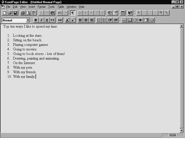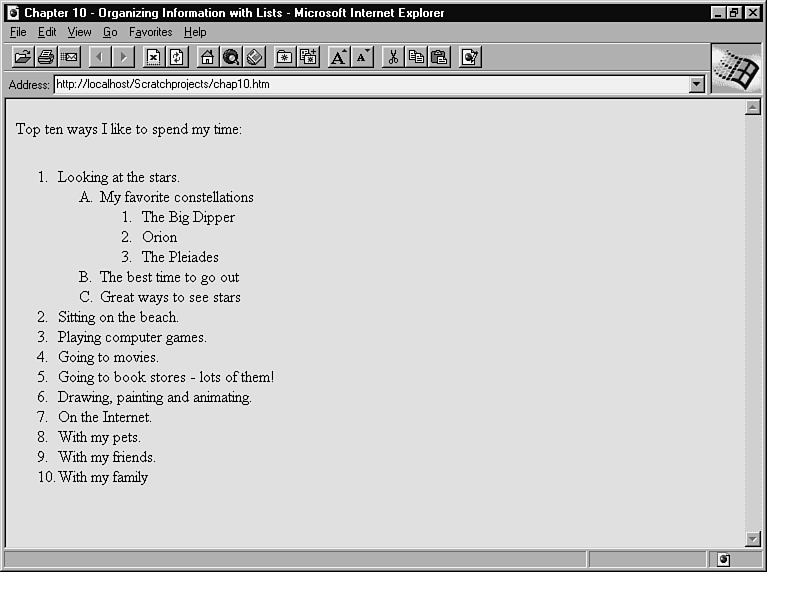 Use numbered lists when you want to present an ordered list of items. Top Ten lists are popular on the Web. Obviously, many people like to use numbered lists. I have my own Top Ten list, shown in Figure 10.1.