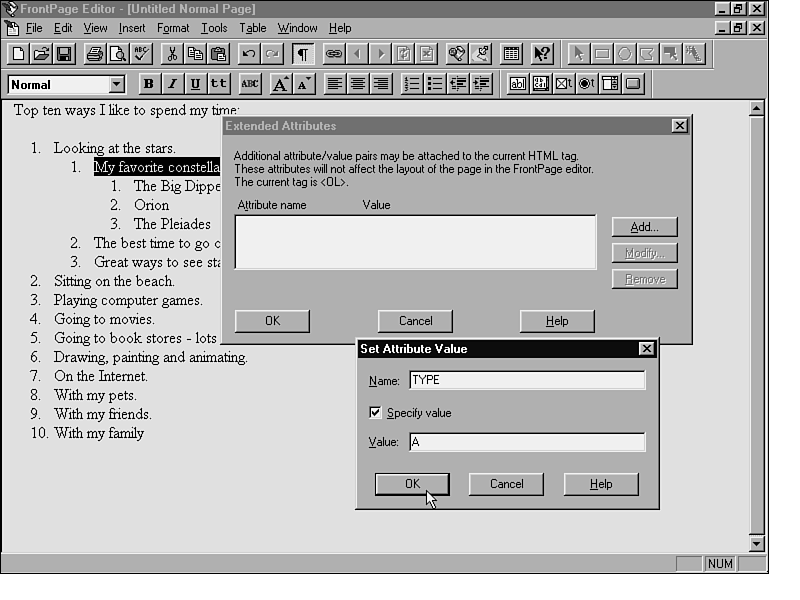 In FrontPage, the default is to use numbers in a numbered list, but you can assign other attributes to them. For example, you can specify large letters, small letters, large Roman numerals, or small Roman numerals in a numbered list. To do this, you use extended attributes. Table 10.1 describes the attributes that you can add to a numbered list.
