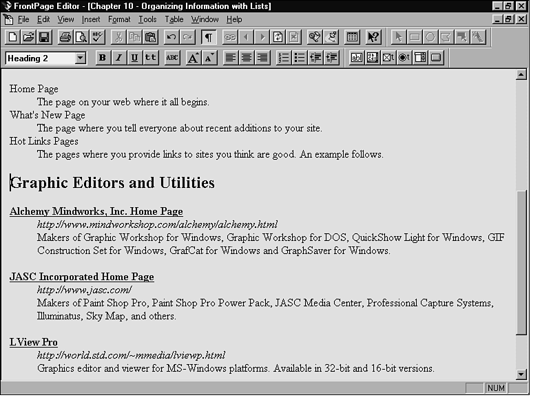 In Figure 10.6, some text formatting has been added. Bold format is used for the page titles, and italic format is used for the URL in the page's definition.