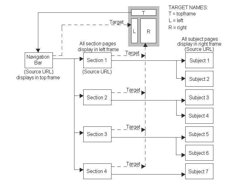 The second source URL, section 1, initially displays in the left frame of the frame set. Each section contains links to different subjects, indicated by solid lines in Figure 14.1. Each section page includes a default target link of right, which displays the section's subject matter in the right frame of the frame set.