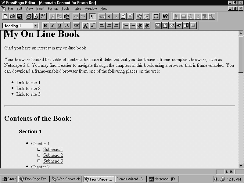 Now you can generate the content of the alternate table of contents. Figure 14.11 shows a portion of the alternate page. It begins by mentioning that these pages appear in links. It also tells the user where to download a frame-compatible browser.