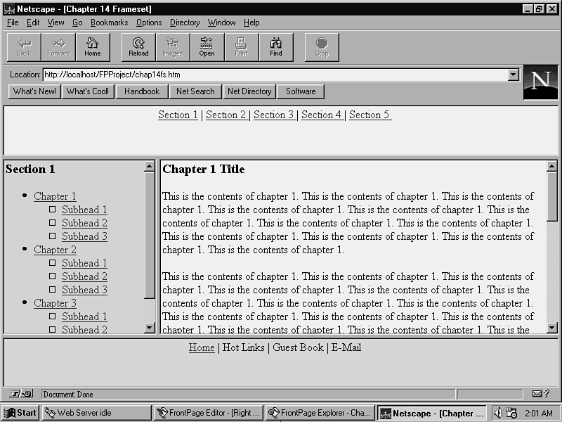 You need to create the frames that are initially displayed in the frame set before you use the Frames Wizard to create the frame set. Save these pages to the currently opened web. You do not have to worry about that for this project because the CD that accompanies this book contains pages for you to work with. This project builds an online book that is displayed in four different frames. Two frames are used as navigation links-one for navigating through the sections of the book and the other frame for navigating to other pages in the web that are not contained in the frame set. The third frame displays the contents for each section of the book. The fourth frame displays the chapter contents. These are simple pages with generic links that help you see how frames work together.
