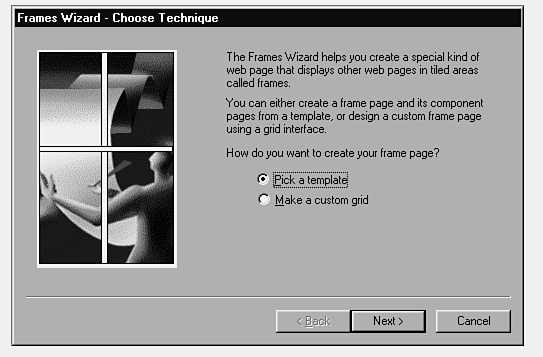 Several frame templates have already been built for you. To use one of these predefined templates, select the Pick a Template option in the Choose Technique panel of the Frames Wizard. The steps are