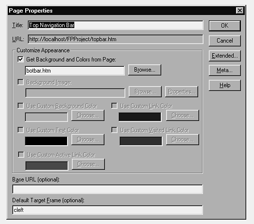 Target frames are applicable when you create links from a framed page to another framed page. You must designate in the source frame's properties the frame in which the target page displays. To do this, assign a default target frame in the page properties of the originating page-that is, the page from which you are linking. The target frame is not the URL of the page to which you are linking. Instead, it is the name of one of the frames in the page, such as left, right, top, or bottom.