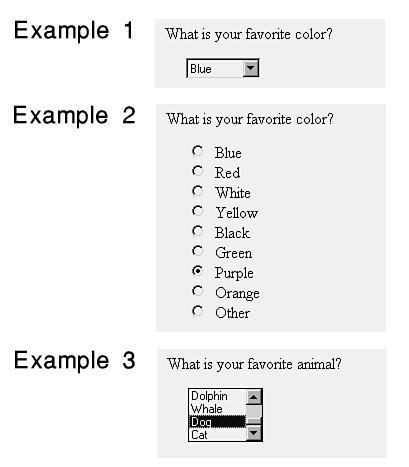 Ask a one of several options question when you want to obtain a single response from a list of choices. An example of a question in this category is What is your favorite color?. Figure 18.9 shows examples of the options for this question.