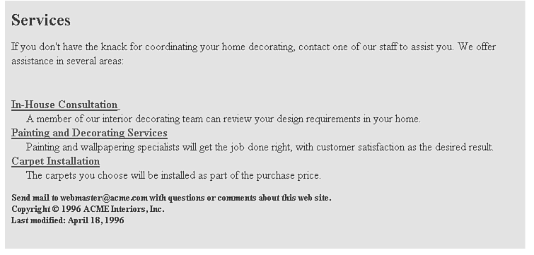 Figures 4.9 and 4.10 show an example of a completed Products and Services page. In the upper portion, shown in Figure 4.9, you see a brief description of the products that the interior design company offers and links to the five pages specified in the wizard screen. In the lower portion of the page, shown in Figure 4.10, you see a brief description of the services that the company offers and links to the three service description pages. The footer appears at the bottom of the page.