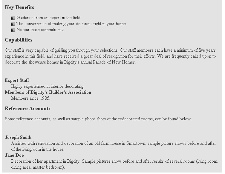 Service description pages tell visitors to your site about the various services and capabilities of your company. A section is provided on the page to describe the key benefits of its products. Figures 4.15 through 4.17 show a service description page at the interior decorating company's site.