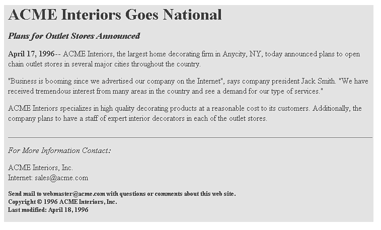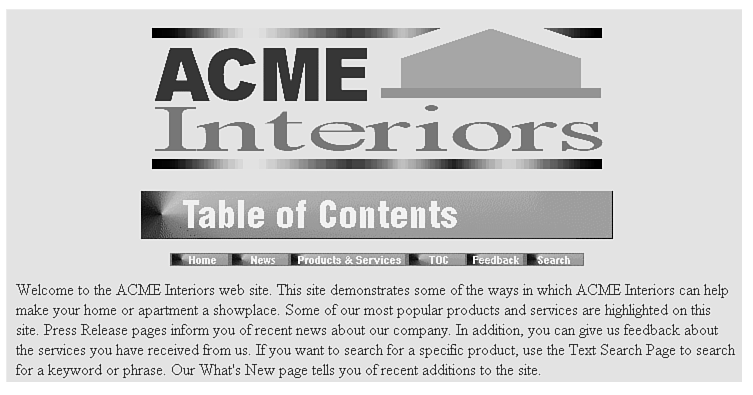 This chapter shows a Web site for a growing interior design firm, ACME Interiors. Its pages include all the available options. With this site as guide, you can start using the Corporate Presence wizard. The steps are