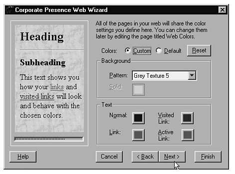 You can customize the colors for the background and text using the screen shown in Figure 4.24. The choices that you make here are saved to your web in a file titled Web Colors (filename _private/style.htm). You can base the style of other pages on this one. This is a great improvement added to FrontPage 1.1.