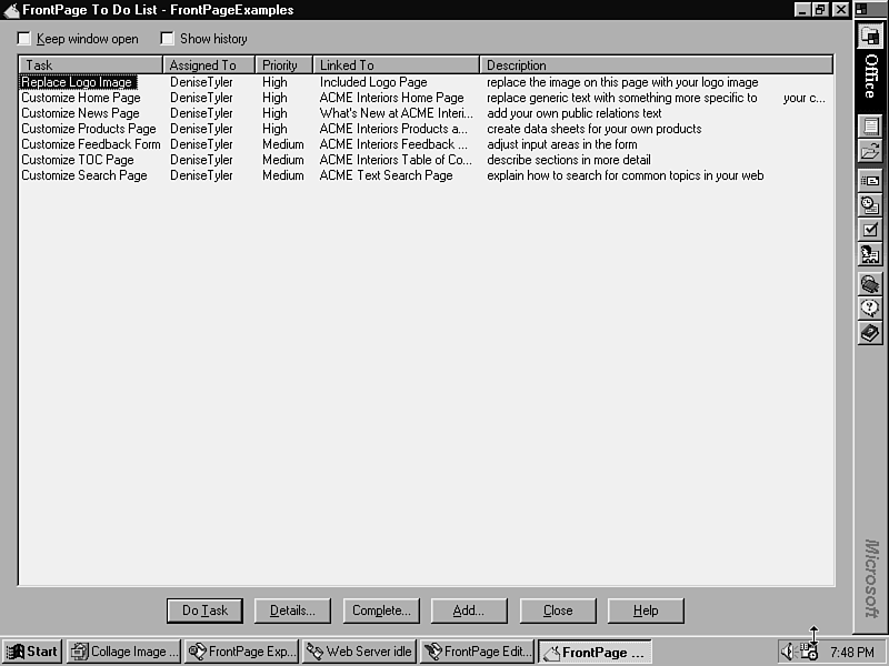 Figure 4.25 shows the To Do List created with the Corporate Presence wizard. You no doubt will want to add more tasks after you review the pages.