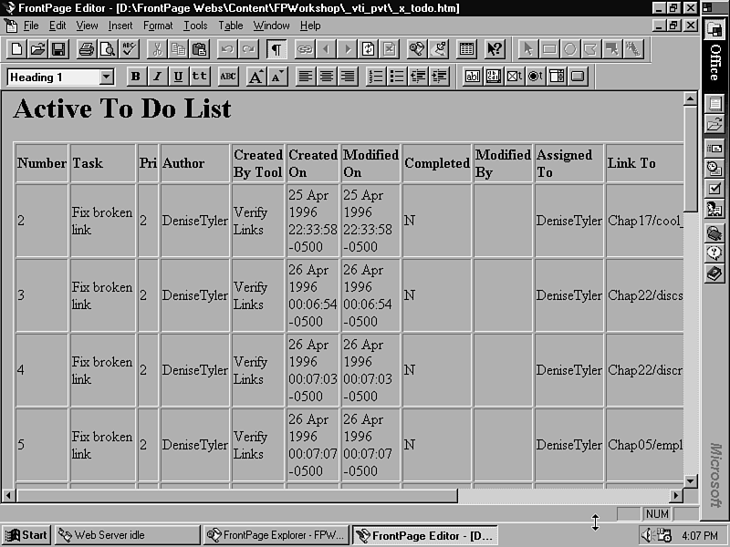 To complete a task, it is best to open the page from the To Do list itself. It is much easier to keep track of the tasks this way. This is a good habit to get into if many authors work on the same web. The To Do List tracks who is assigned to a page or a task.
