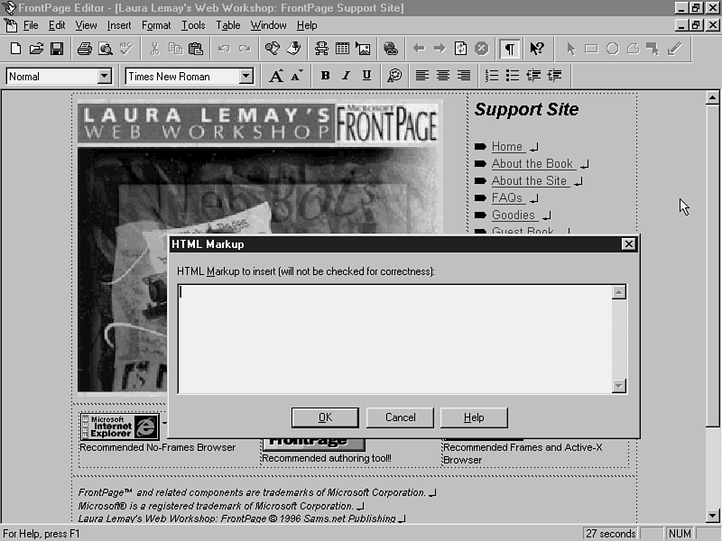 What happens if you insert code that the FrontPage Editor does not directly support? FrontPage 97 fields the code, and it handles the situation automatically for you. When you return to the FrontPage Editor, you see small yellow rectangles on your page with question marks in them. These are HTML Markup bots, which are covered in the next task.