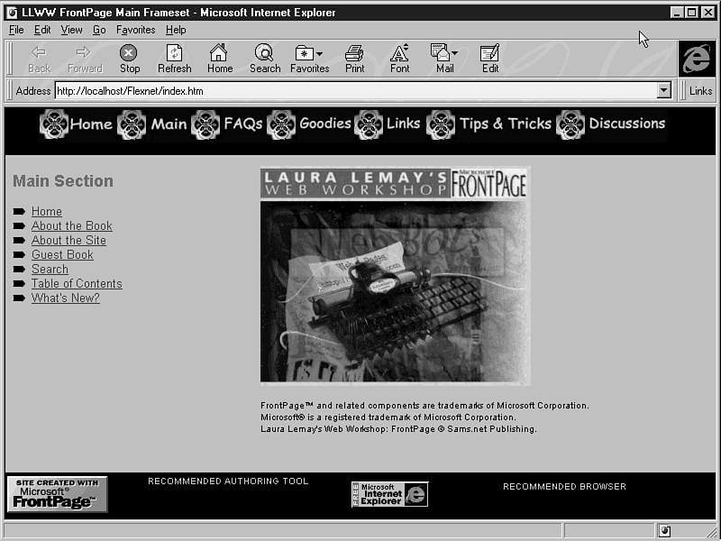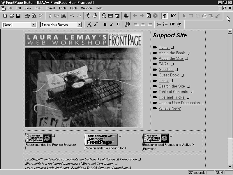 Frames are designed with the Frames Wizard. If you try to edit the page in the FrontPage Editor, the Frames Wizard opens again so you can edit the frame's configuration. The FrontPage Editor has the majority of the frame tags built in. Internet Explorer 3.0 supports the capability to display additional attributes for frames that really enhance the appearance of your framesets. These attributes are as follows: