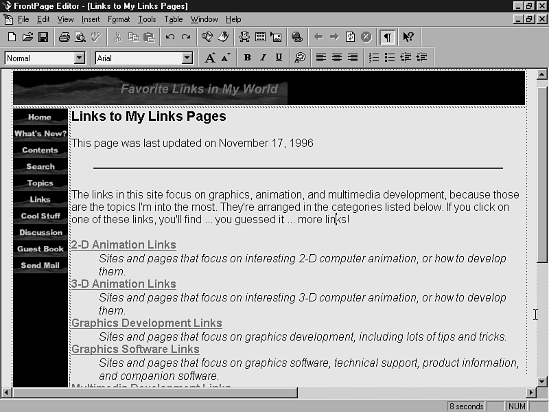 Figure 18.25 : The Main Section TOC page links to the pages that appear in the contents frame of your frameset. In addition, a Home link takes the user back to the Welcome Splash Screen, and a Discussion link takes the user