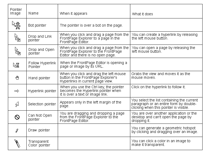 When you move the cursor over some objects on the page or perform some tasks in the FrontPage Editor and the FrontPage Explorer, you see various cursors. Table B.4 explains what the cursors signify.