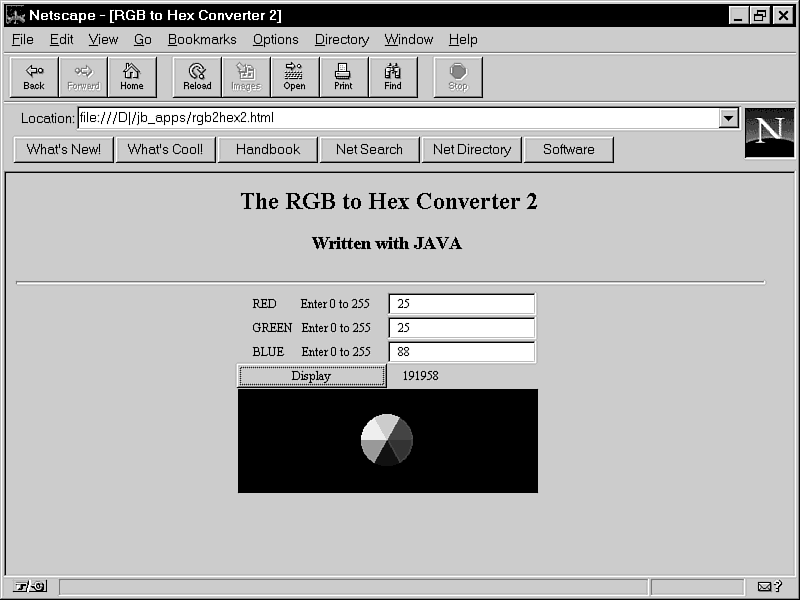 In this section, you will extend the RGB2Hex applet by adding a color wheel in the middle of the applet's canvas. Having a color wheel will provide a means of contrasting the color the user has entered with other existing colors and will assist your users in picking values for the color they want.