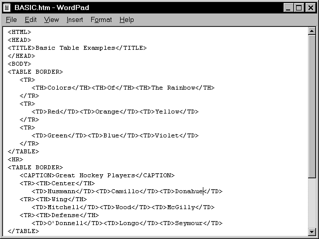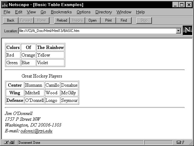 The HTML for a basic table is shown in figure 13.1. All of the table elements used are supported by the latest versions of the most popular Web browsers: Netscape Navigator, Microsoft Internet Explorer, and NCSA Mosaic. This table, as rendered by Netscape Navigator, is shown in figure 13.2.