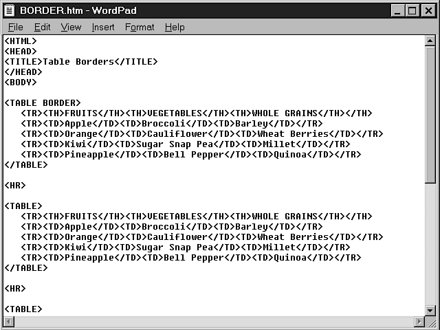 As mentioned previously, the BORDER attribute to the <TABLE> element is what gives the borders around the table elements. Even though this attribute is off by default, for most conventional tables-those used to organize information in a tabular format-borders are usually used to accentuate the organization of the information. Consider the HTML document shown in figure 13.5 and rendered in figure 13.6. In this case, the organization of the information is much easier to see in the version that includes borders.